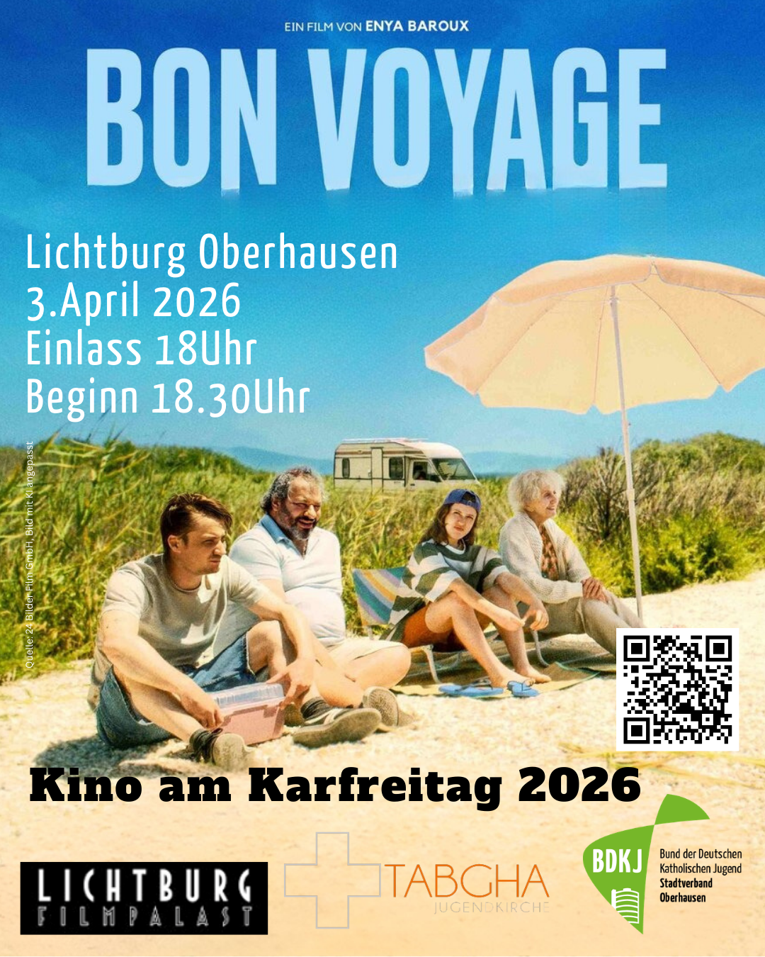 Das junge Filmkuratorium des BUNDESVERBANDES KATHOLISCHER JUGEND und der JUGENDKIRCHE TABGHA hat für den 03.04. um 18:30 Uhr - EINLASS ab 18:00 Uhr - den wunderbaren Film Bon Voyage für das KARFREITAGSKINO ausgesucht, um einen Moment innezuhalten im Kulturort KINO.